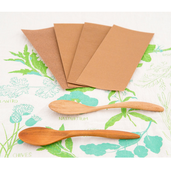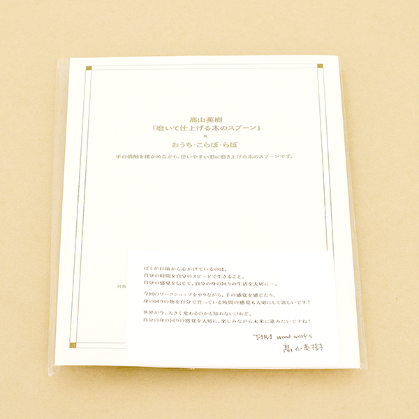 スプーン×1(素材|桜)、やすり×4種各1枚(#120・#240・#320、#400)、髙山英樹メッセージカード、作り方