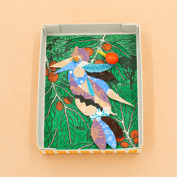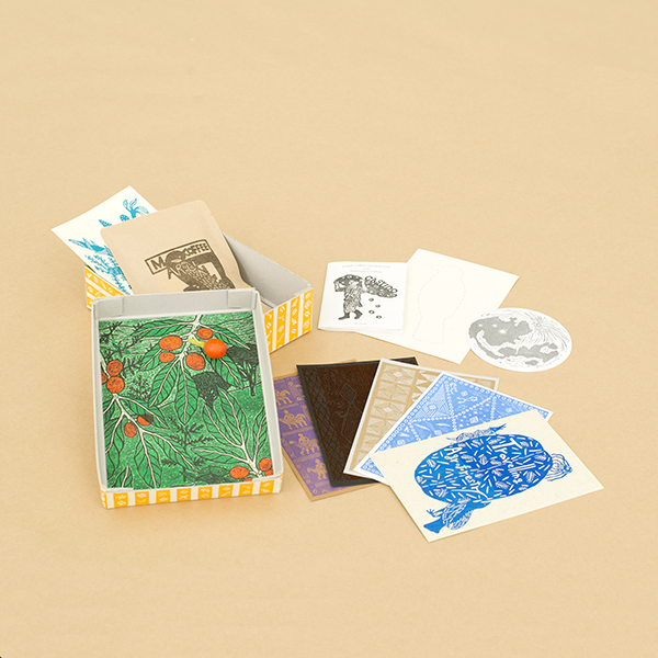 箱の中には、鳥の型紙とカラフルな紙、現地の豆を使ったドリップパックが入っています。