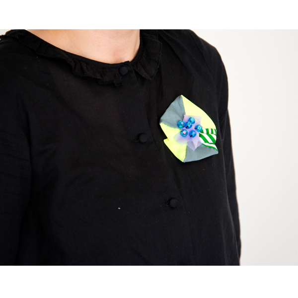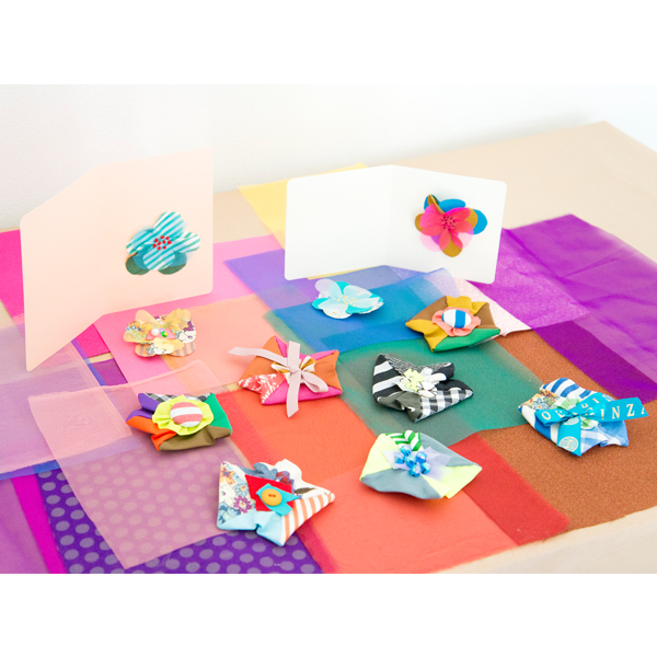 ハギレを組み合わせて、ブローチやカードがつくれます。