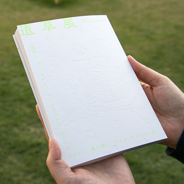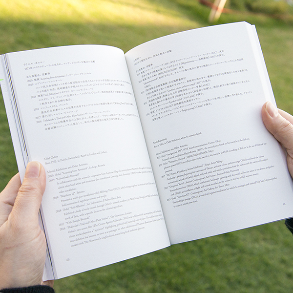 展示風景の記録のほか、出展アーティストが自らの制作における植物の役割やフィールドワークの実践について語ったインタビューを収録。また、今年4月に惜しまれつつも亡くなったロイス・ワインバーガーの活動を振り返る追悼文や担当学芸員が各アーティストの作品を読み解くテキスト等掲載。